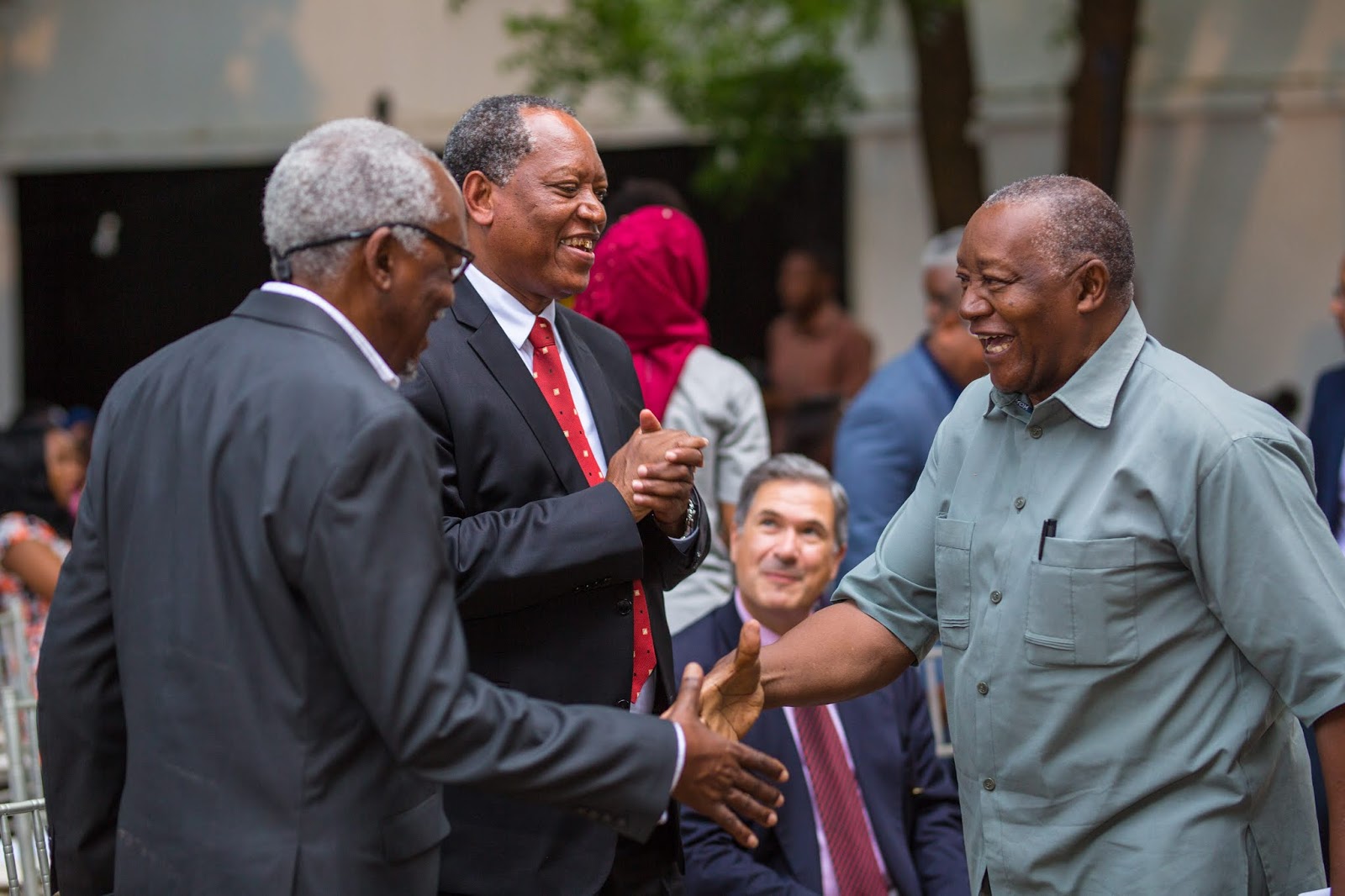 | Left H.E. French Ambassador Fredric Clavier with former Ambassador Christopher Liundi sharing a light moment at the launch of this iconic republished Tanzanian Spy Fiction series |